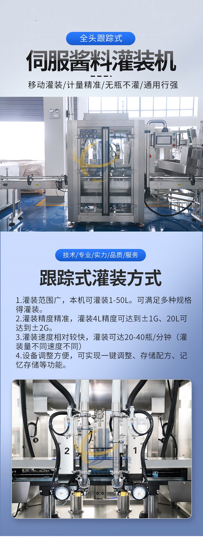 這款全自動跟蹤式醬料灌裝機是本公司研發(fā)的新款專為醬廠研發(fā)的生產(chǎn)設(shè)備,跟蹤式醬料灌裝機適用范圍:沙拉汁、調(diào)味汁、千島醬、番茄醬、胡椒醬、糖漿、蜂蜜、枇杷膏、辣椒醬、牛肉醬、洗手液、洗衣液等的灌裝。