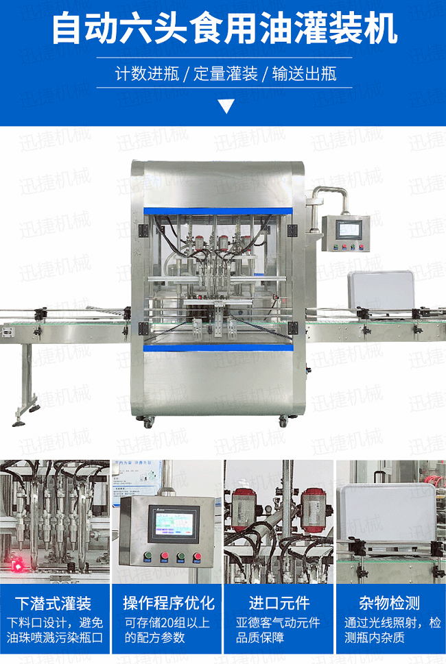 橄欖油灌裝旋蓋成套設備采用伺服柱塞式計量灌裝原理,適用于各種規(guī)格(0.1-1升可兼顧到2升灌裝)的南瓜籽油、榛子油、牡丹籽油、芝麻油、核桃油、山茶油、亞麻籽油、棉籽油、橄欖油、大豆油、玉米油、菜籽油等食用油灌裝。設備采用伺服系統(tǒng)定量推料,在人機界面數字化調節(jié)計量,并且可設定100ml或200ml等所需計量,觸摸屏一觸即達,而且可以單頭微調計量。操作簡單,維護方便,節(jié)省人工成本,生產效率更高。