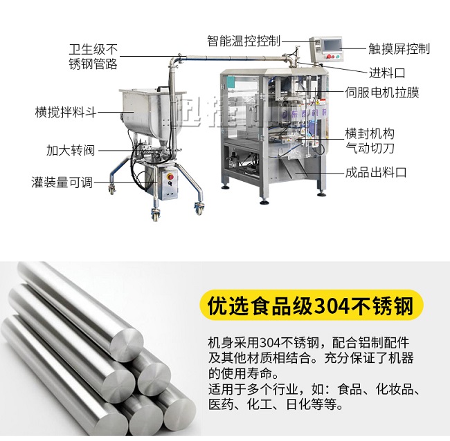 本機(jī)器主要用于調(diào)味品醬料的自動(dòng)化包裝,機(jī)器安裝有橫向螺帶式攪拌,使油醬混合均勻,確保灌裝精度和產(chǎn)品包裝成品的均勻性。灌裝計(jì)量設(shè)備安裝有萬(wàn)向輪,管路鏈接均采用快拆接頭,方便灌裝機(jī)拆卸移動(dòng)清洗。包裝設(shè)備采用全伺服驅(qū)動(dòng)器,包裝速度快,運(yùn)行穩(wěn)定。設(shè)備構(gòu)成組件:攪拌式定量灌裝機(jī)一臺(tái)管道鏈接組件2米。