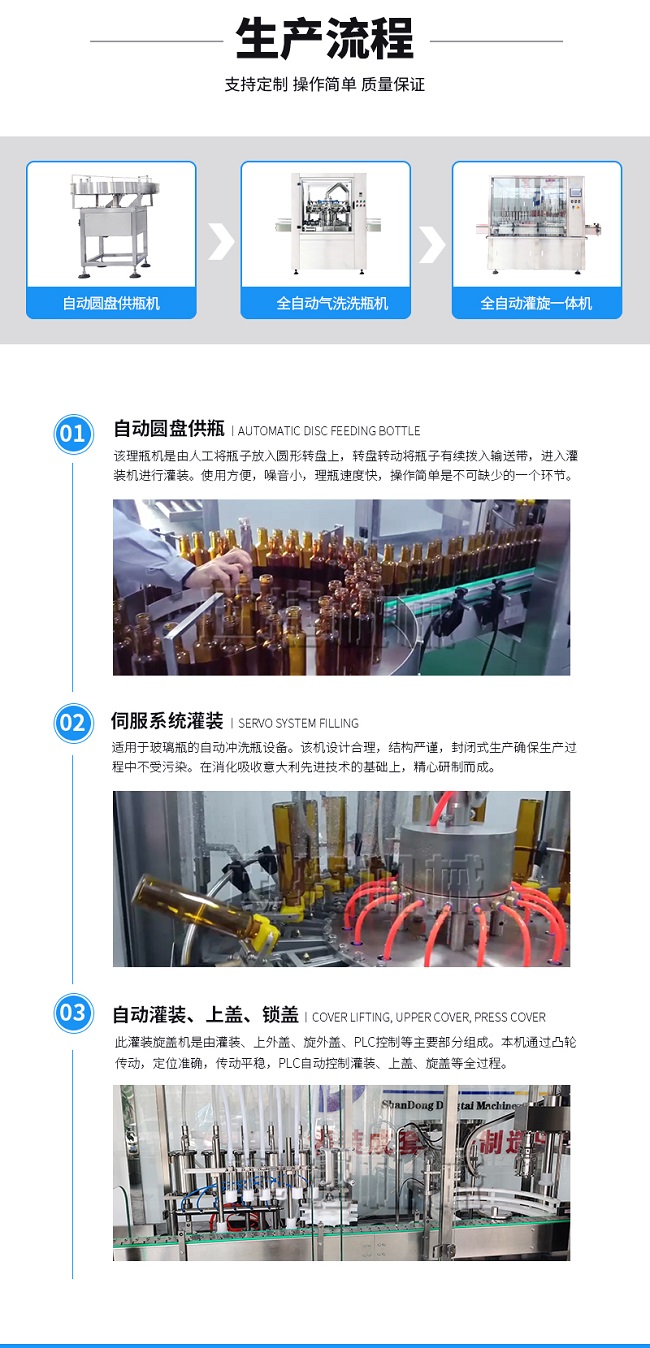 本灌裝流水線設備具有穩(wěn)定可靠、自動化水平高,相比同類產(chǎn)品有著更長的使用年限,維護簡單,整線中各設備的協(xié)調(diào)性、連貫性強,整線設計合理等特點。灌裝設備采用系統(tǒng)結(jié)構(gòu),為當今行業(yè)內(nèi)水平,整線滿足量產(chǎn)化、集成化生產(chǎn)的需要。