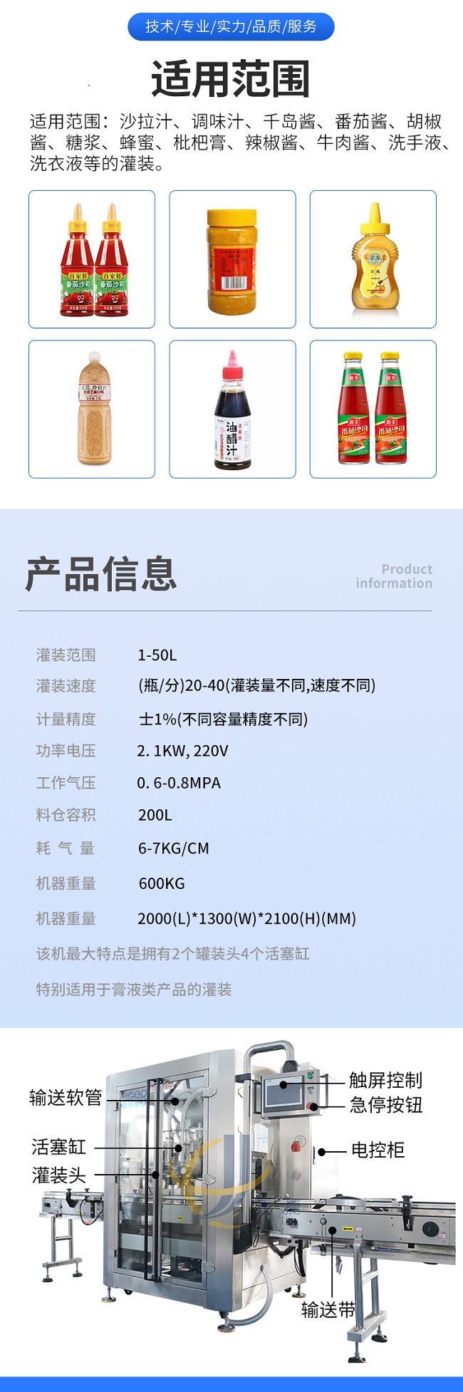 這款全自動跟蹤式醬料灌裝機是本公司研發(fā)的新款專為醬廠研發(fā)的生產(chǎn)設(shè)備,跟蹤式醬料灌裝機適用范圍:沙拉汁、調(diào)味汁、千島醬、番茄醬、胡椒醬、糖漿、蜂蜜、枇杷膏、辣椒醬、牛肉醬、洗手液、洗衣液等的灌裝。