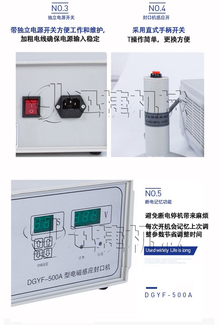 本手持式電磁感應(yīng)鋁箔封口機是利用電磁感應(yīng)的原理,將瓶口上的鋁箔片瞬間產(chǎn)生高熱,然后熔合在瓶口上,使達到封口的功能。具有良好的防潮、防霉、防偽作用,起到延長物品保存周期的目的。封口容器的材質(zhì)可以是聚乙(PE)、聚丙烯(PP)、聚酯(PET)、聚苯乙烯(PS)、ABS以及玻璃等,不能用于金屬瓶體及瓶蓋。(本公司同時提供各種材料感應(yīng)鋁箔膜)。