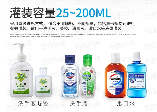我們的雙手需要接觸的物品是在太多,在我們不能確定手是否清潔時(shí)要避免用手接觸口鼻和眼睛,這樣做還是有好處的,大大降低了病毒入侵我們的身體。洗手是相當(dāng)有必要的,其使用免洗手消毒液洗手那更是萬全之策,然而我們迅捷機(jī)械研發(fā)生產(chǎn)出免洗手消毒液灌裝生產(chǎn)線,自動(dòng)化消毒液灌裝生產(chǎn)線是為市場(chǎng)對(duì)年洗手消毒液的需求而研發(fā)誕生的,該設(shè)備自動(dòng)化程度高,性能穩(wěn)定,生產(chǎn)速度快,灌裝準(zhǔn)確,操作簡(jiǎn)單、調(diào)整方便,適應(yīng)性強(qiáng)等特點(diǎn),免洗手消毒液灌裝生產(chǎn)線是相關(guān)行業(yè)必備的現(xiàn)代化灌裝機(jī)械設(shè)備。