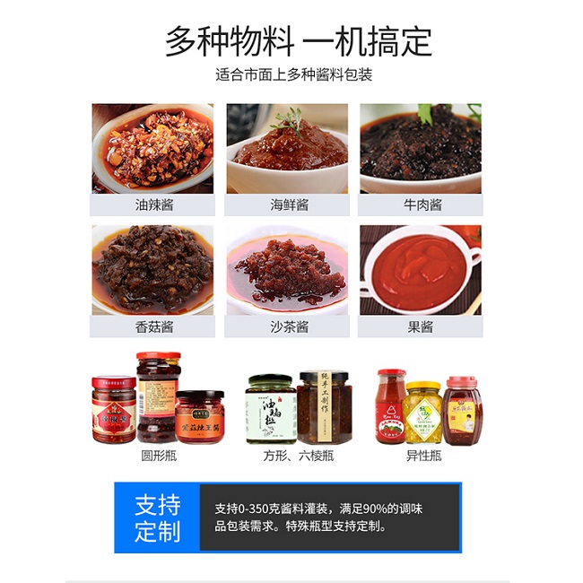 牛肉醬灌裝機(jī)采用活塞式氣缸氣動(dòng)原理,適用于調(diào)味品中帶顆粒并且濃度較大的香菇醬、辣椒醬、豆瓣醬、花生醬、芝麻醬、果醬、牛油火鍋底料、紅油火鍋底料等較為粘稠醬類的灌裝。灌裝轉(zhuǎn)閥可以很具客戶物料定做加大,以適應(yīng)不同客戶物料的灌裝需求。