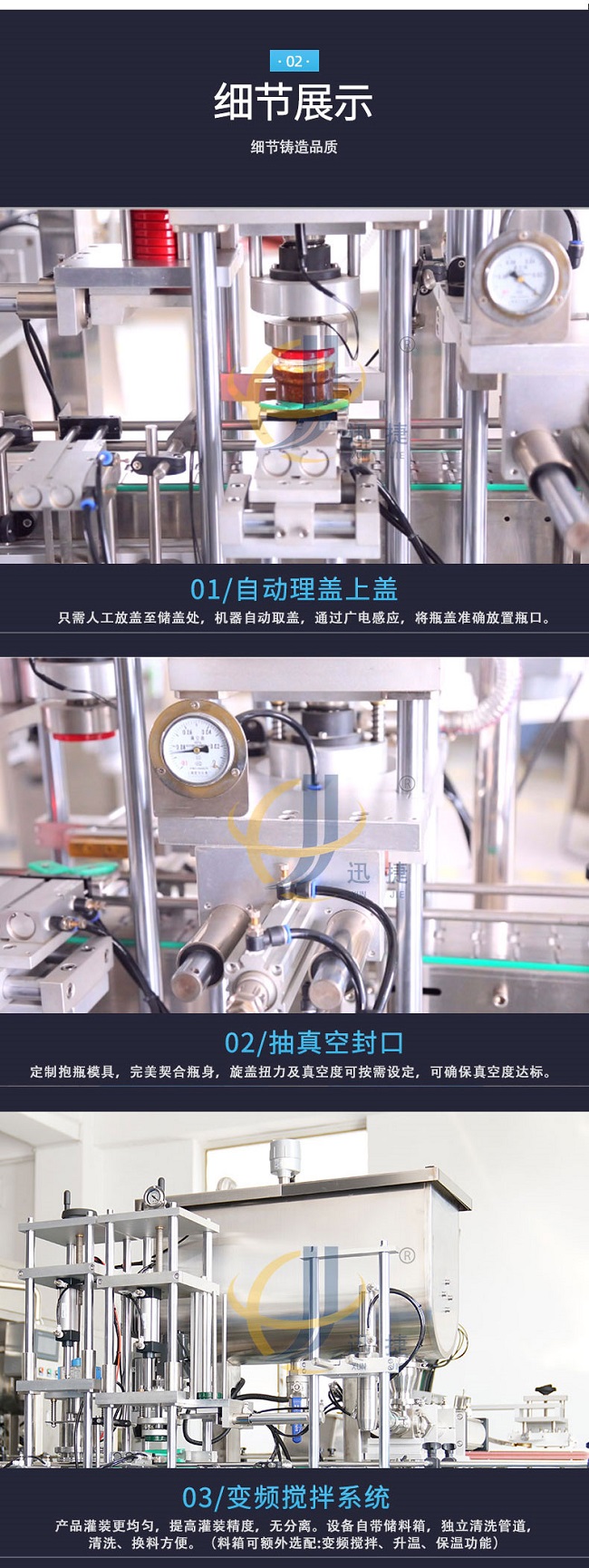 迅捷機械加工設備齊全,技術力量雄厚,選用德國PLC控制系統(tǒng)、臺灣AirTac的氣動組件和臺灣伺服的電控組件,從這幾個部件可以看的出來全自動牛肉醬灌裝機改善的不僅是質(zhì)量,生產(chǎn)效率和產(chǎn)品的外觀包裝,還會不斷的引進國際上新的科學技術,全自動牛肉醬灌裝機用更好的質(zhì)量滿足生活的需求。在自動化生產(chǎn)日漸普及的今天,全自動牛肉醬灌裝機讓企業(yè)的商品以更快的速度出現(xiàn)在市場中,畢竟一些繁雜的工作讓人工去完成的話不但麻煩,效率也不會很高,想要適應現(xiàn)代化的大規(guī)模批量生產(chǎn),就需要全自動牛肉醬灌裝機的幫助來代替人工完成這些繁雜的工作。